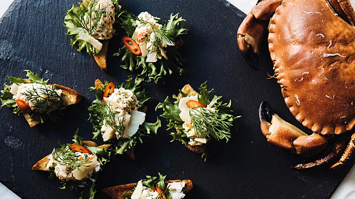 5) Lägg en liten bit krispsallad på varje brödbit och toppa med krabbröran. Dekorera med chili, dill och parmesanflakes. För lite extra sting kan en droppe tabasco ovanpå vara gott.