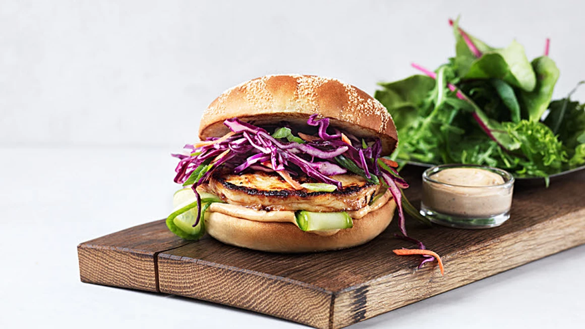 BBQ halloumiburger med rödkålsslaw & picklad gurka.