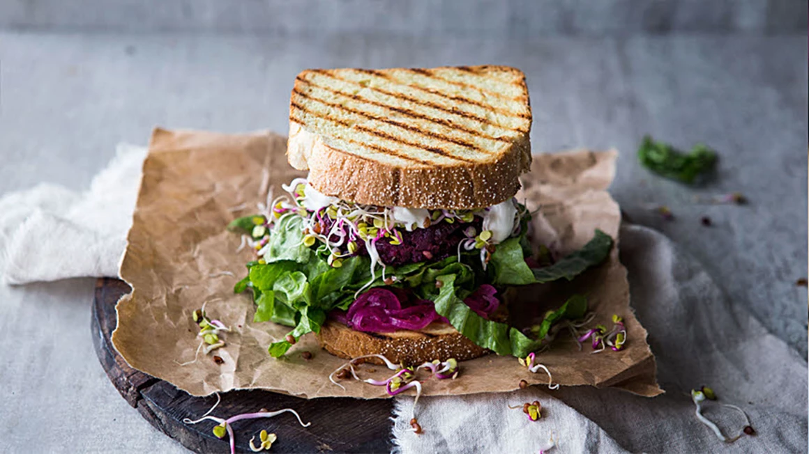 Rosta Max Frisco Toast i en torr stekpanna eller brödrost och servera tillsammans med knaprig rödbetsburgare, picklad rödlök, krispig romansallad, groddar och krämig vitlöksaioli.