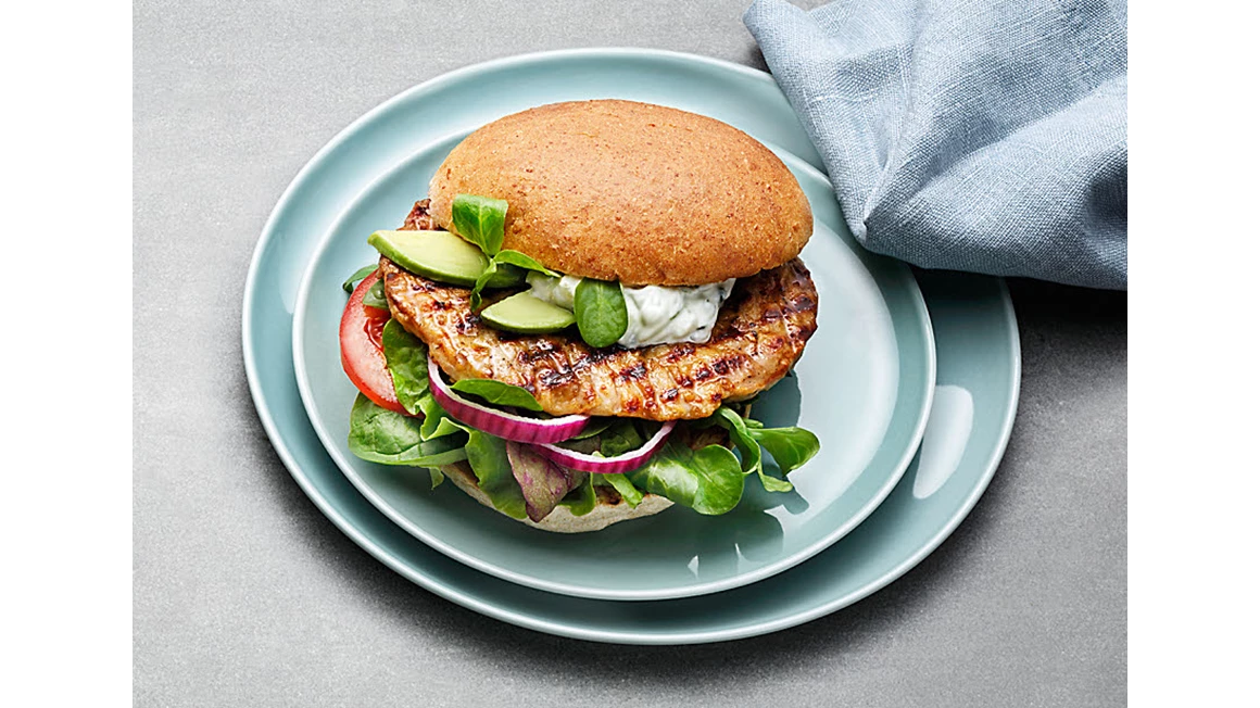 Tillaga Delifresh kycklingburgare enligt anvisning. Ta ett hamburgerbröd, lägg valfri mixsallad, rödlök och en tomatskiva i botten. Lägg på kycklingburgaren. Stryk på en klick tzatziki, toppa med några skivor avokado och lägg på locket. Servera direkt.
