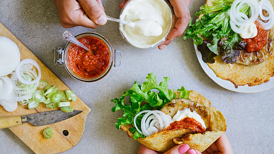 Börja med halloumi- och vitkålswrapsen om du väljer att göra egna bröd. Följ sedan receptet för ajvaren. Stek burgaren i olja på medelstark värme, djupfryst ca 3 min per sida, tinad ca 2 min per sida. Eller ännu hellre, grilla 2-3 min på varje sida. Lägg burgaren i wrapen och toppa med sallad, ajvar, lök och majonnäs
